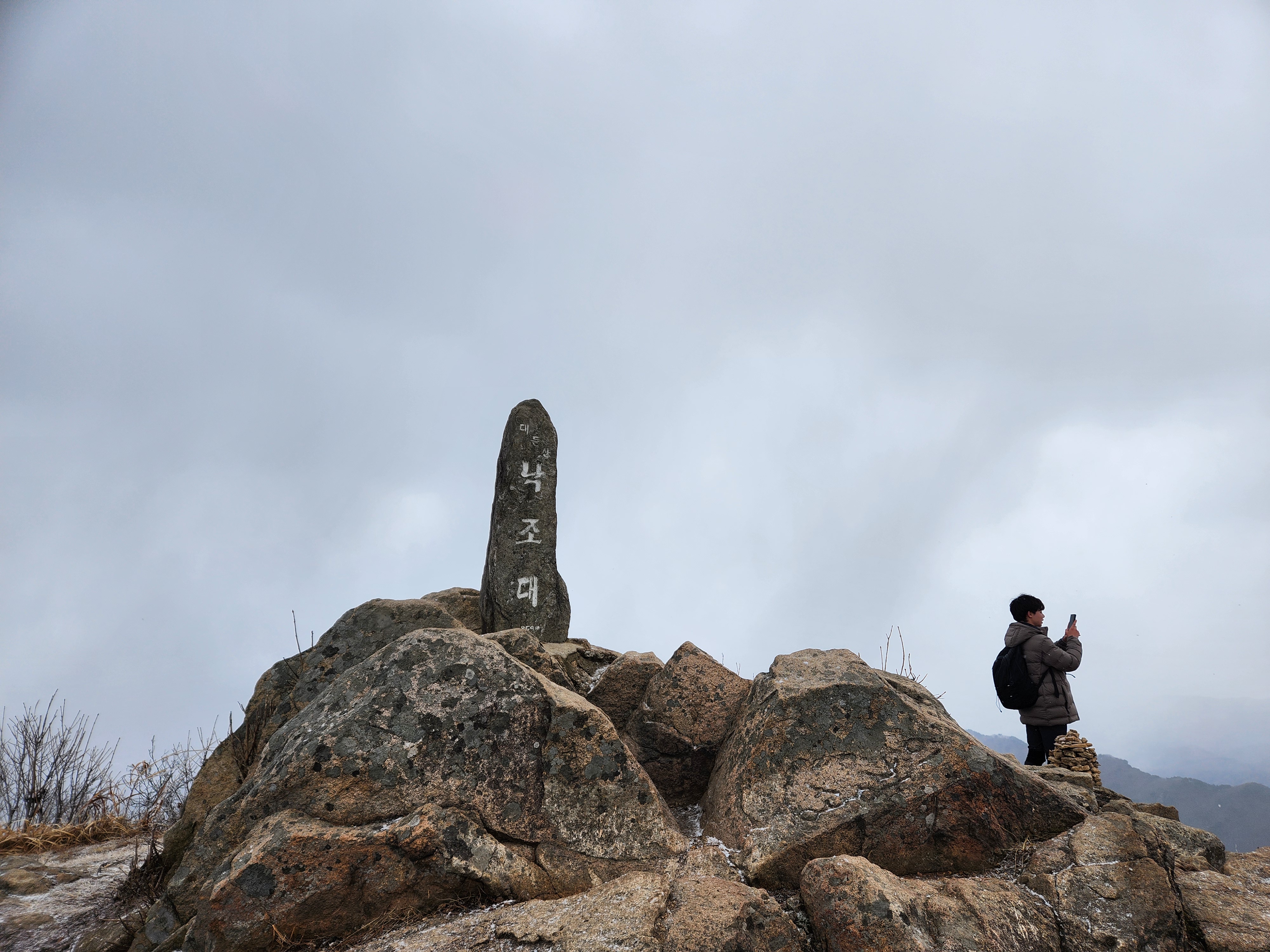정상에서 좌우로 펼쳐진 암릉이 상고대와 어울려 멋졌다(11:33). 다른 이들도 그 모습에 감탄사를 쏟아냈다. 낙조대 쪽으로 가는데 눈발이 날렸다. 낙조대 표지석이 길쭉한 게 보기 좋았다(12:03). 그 뒤를 지나는 젊은 친구와 함께 사진으로 담았다. 눈발이 조금 더 세지는데 무척 예뻤다. 발걸음이 조금 빨라졌다.